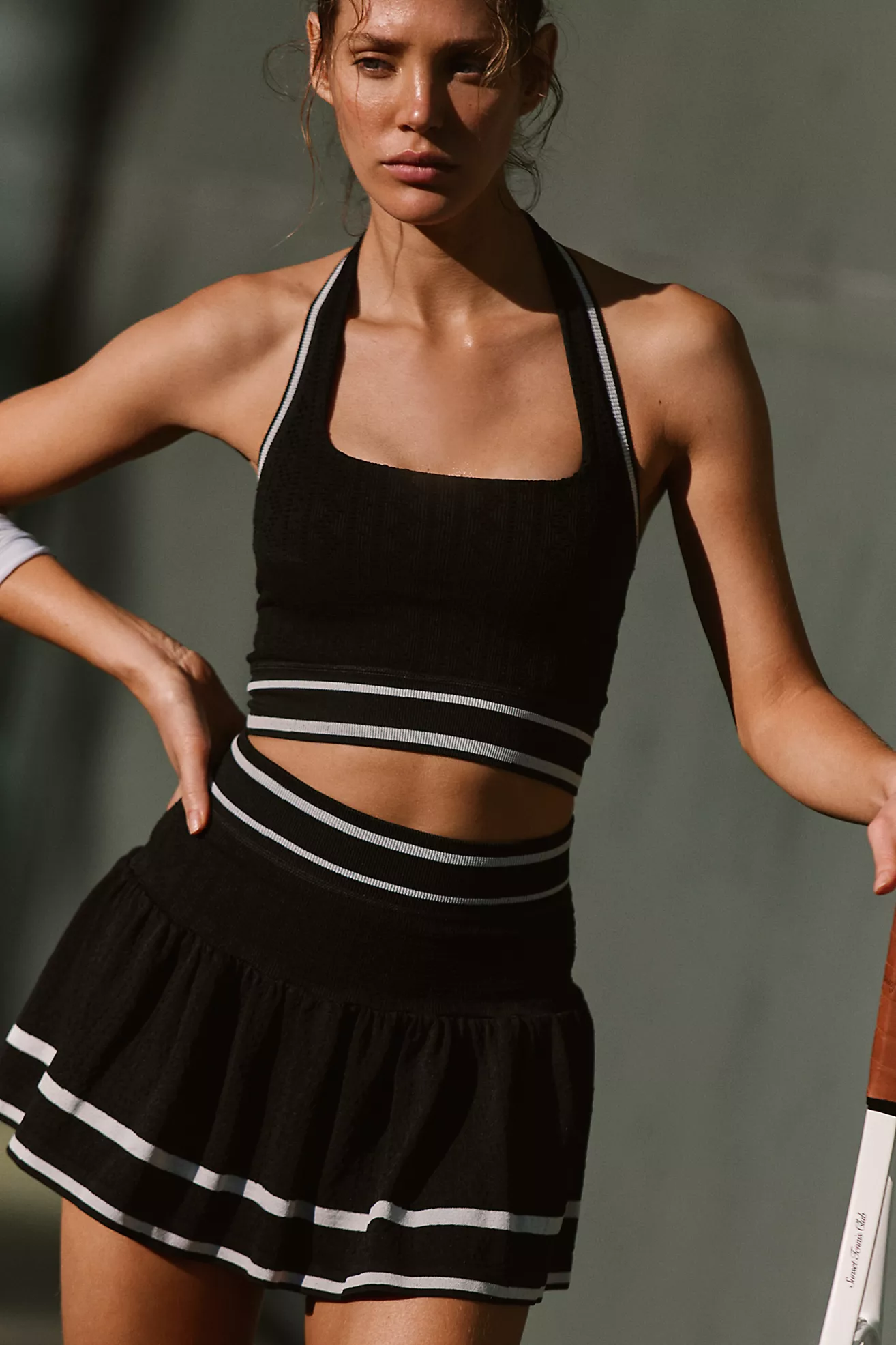 Just as cool as it is classic, this stunning set is featured in a super sporty style with halter-neck crop top and coordinating high-rise mini skirt for the ideal one-in-one look for absolutely any activity.