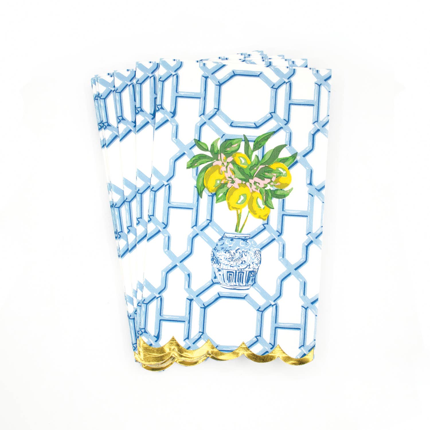 Transform your guest bathroom into a stylish retreat with these Lemon Ginger Paper Guest Towel Packs. Each set delivers 16 elegantly designed single-use towels featuring a captivating lemon tree motif set in a chinoiserie-inspired ginger jar against a classic blue trellis backdrop. Delicate gold foil scalloped edges add refined shimmer and sophistication to every use. Whether you're entertaining guests or stocking your powder room, these towels blend practicality with preppy charm, making even the smallest details feel intentional and polished. Perfect for those who appreciate thoughtful design in everyday essentials.
